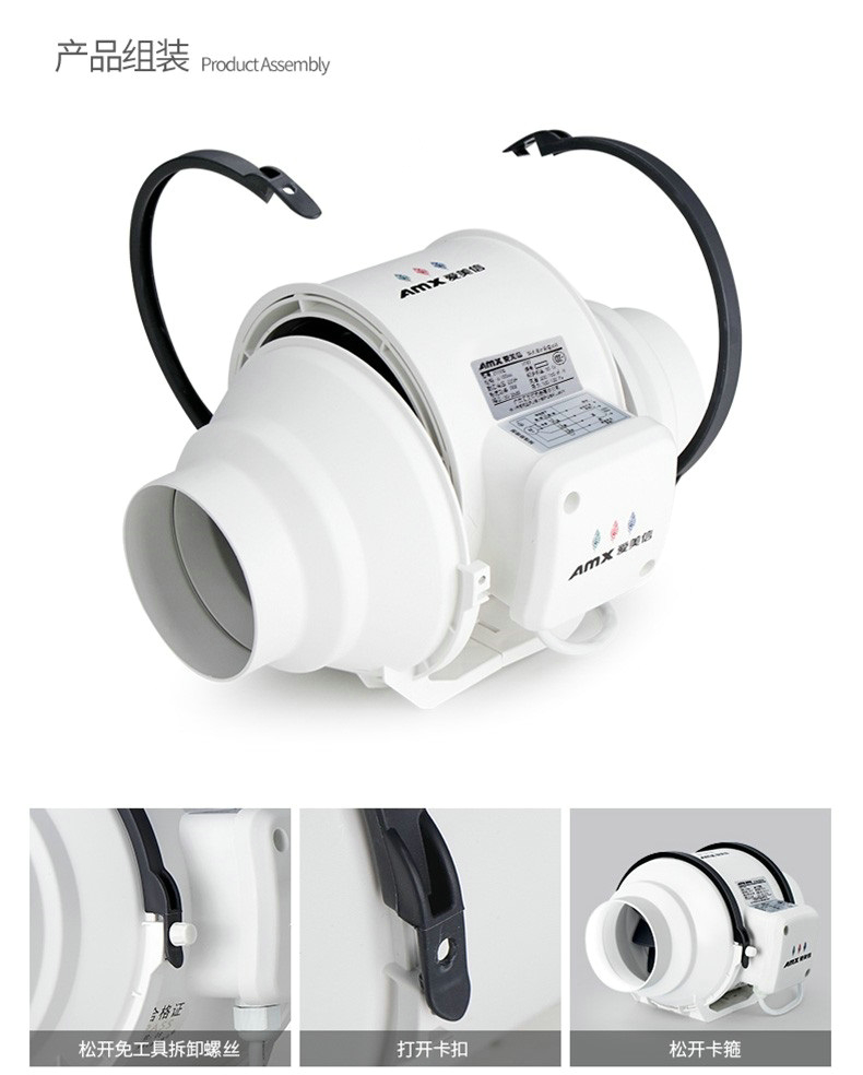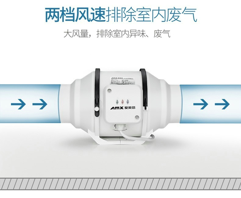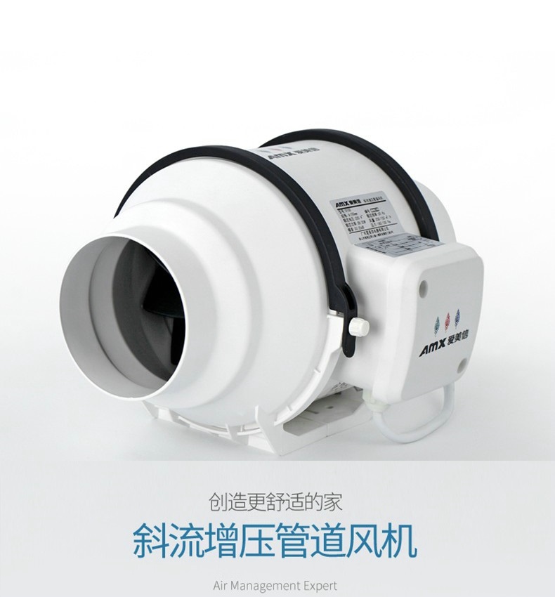 爱美信斜流管道风机,具有款式新颖,造型美观,风量大,噪音低,滚珠电机,使用寿命长。