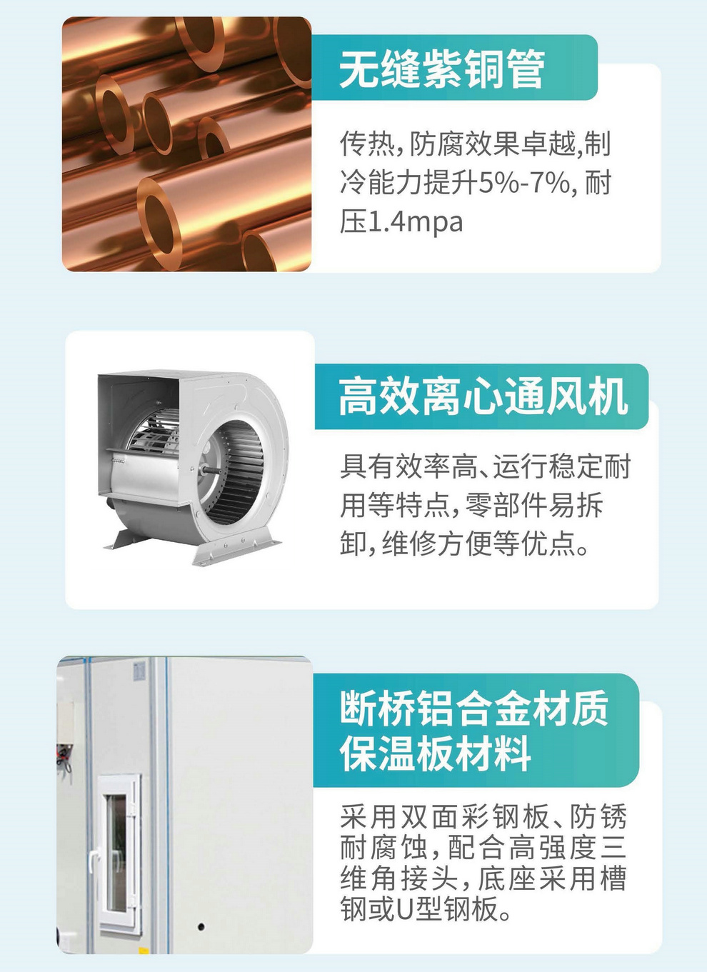 无缝紫铜管:传热,防腐效果卓越制冷能力提升5%-7%,耐压1.4mpa 高效离心通风机:具有效率高、运行稳定耐用等特点零部件易拆卸,维修方便等优点。 断桥铝合金材质保温板材料:采用双面彩钢板、防锈耐腐蚀,配合高强度三维角接头,底座采用槽钢或U型钢板。