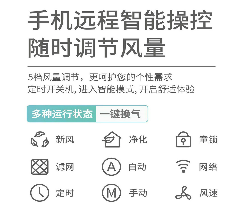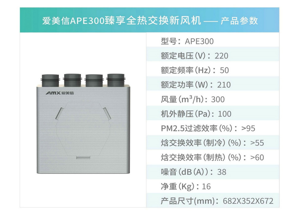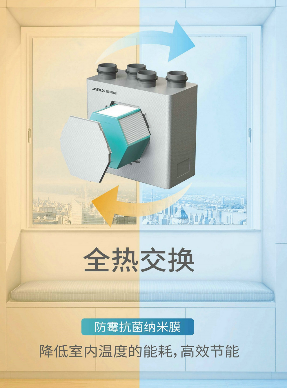 全热交换:双向流换气,带交叉逆流式高效全热交换芯体,热交换效率高,节约能源